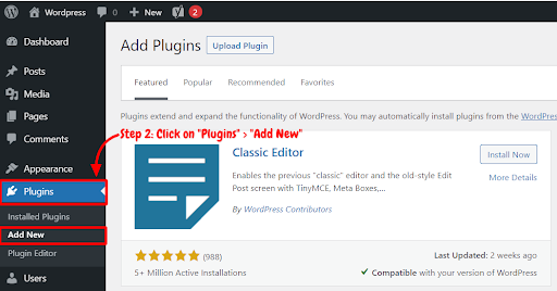Step 2: Now, you will see the option “Plugins” on the left-hand side panel. Click on “Plugins,” then select “Add New.”