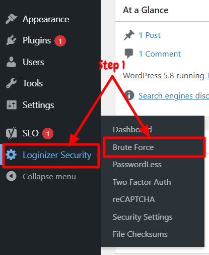 Step 1: First, go to the “Loginizer Security” option available on the left side panel of the WordPress dashboard. Choose “Brute Force“.