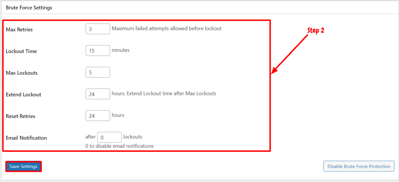 You can configure and set the above fields the way you want. After configuring these values, click on “Save Settings “. You can also disable the Brute Force protection.