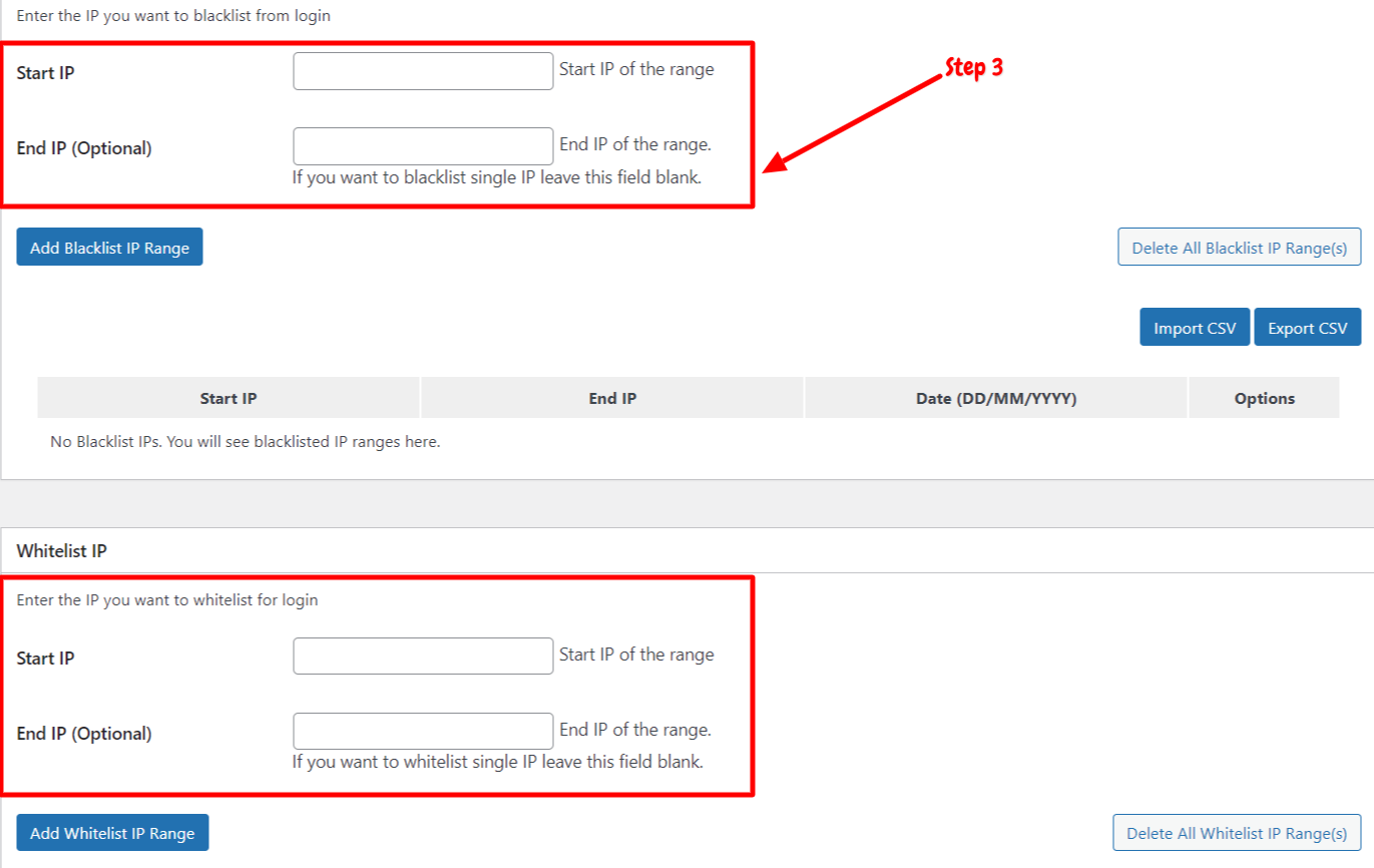 Step 3: Now, scroll down to blacklist and whitelist IPs. You can enter the IPs which you want to blacklist or whitelist. You can also add blacklist or whitelist IPs range by click on “Add Blacklist and Whitelist range.”