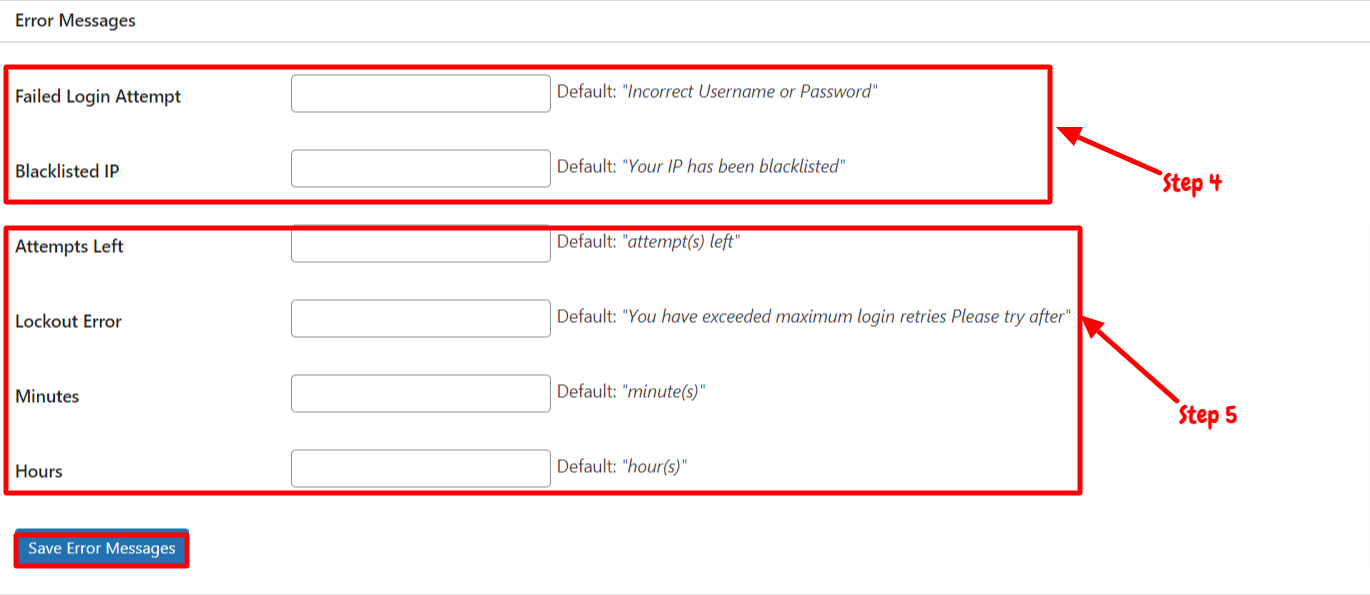 Step 5: In the Blacklisted IP field, type your custom error message. This message will display if a login attempt is made from an IP address that is blacklisted. Likewise, you can also show error messages for attempts left, lockout error, minutes, and hours left. Now, click the Save Error Messages button to preserve your changes.