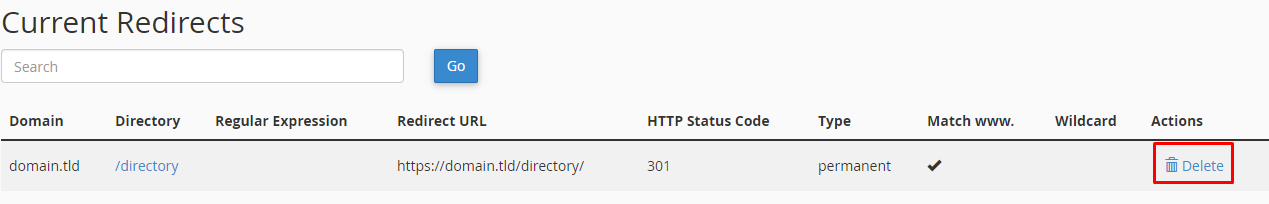 Once created, the redirect will appear on the bottom of the page and you’ll be ready to delete it if needed: